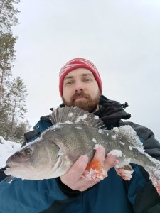 Через минуту ожесточённого сопротивления на льду показывается внушительная морда черного коряжного окуня, как потом выяснилось мой трофей 537г, знаю, многих не удивит, но оттого он и МОЙ трофей)))