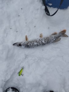 Всем привет народ, вышел с утра с тополей на пиковую, ветер и снег в лицо, навстречу 4 рыбака и товарищ, говорят ничего нет, пошел ниже по течению, к другим товарищам, говорят есть бель и чуток клыкастого,я пробурился, в прибор рыба есть, меняю вибы, бах удар, сработал 19g KYODA VIB p1708 и судачек на 600г, дальше тишина и тут дело дошло до 90 китайского виба типа вагнер цвета космос, бах, удар, мимо, второй и есть, достаю судака на 1.500 потом сход, потом карандаш и на этом всё.(извините фото нет сайт не даёт).