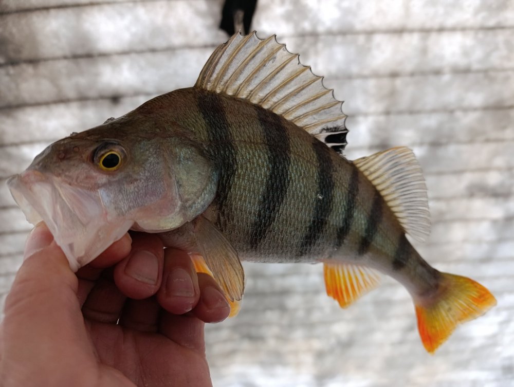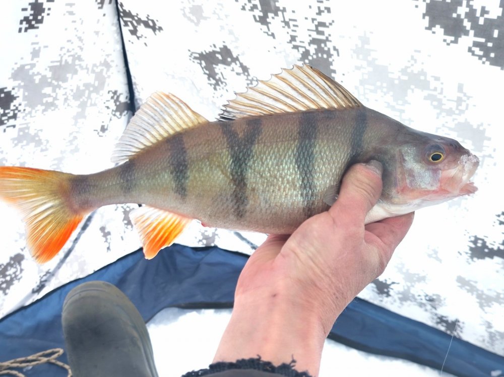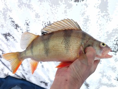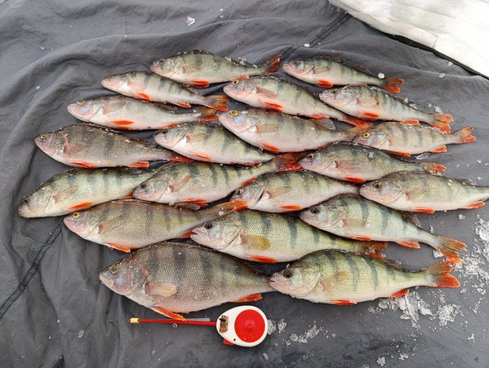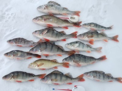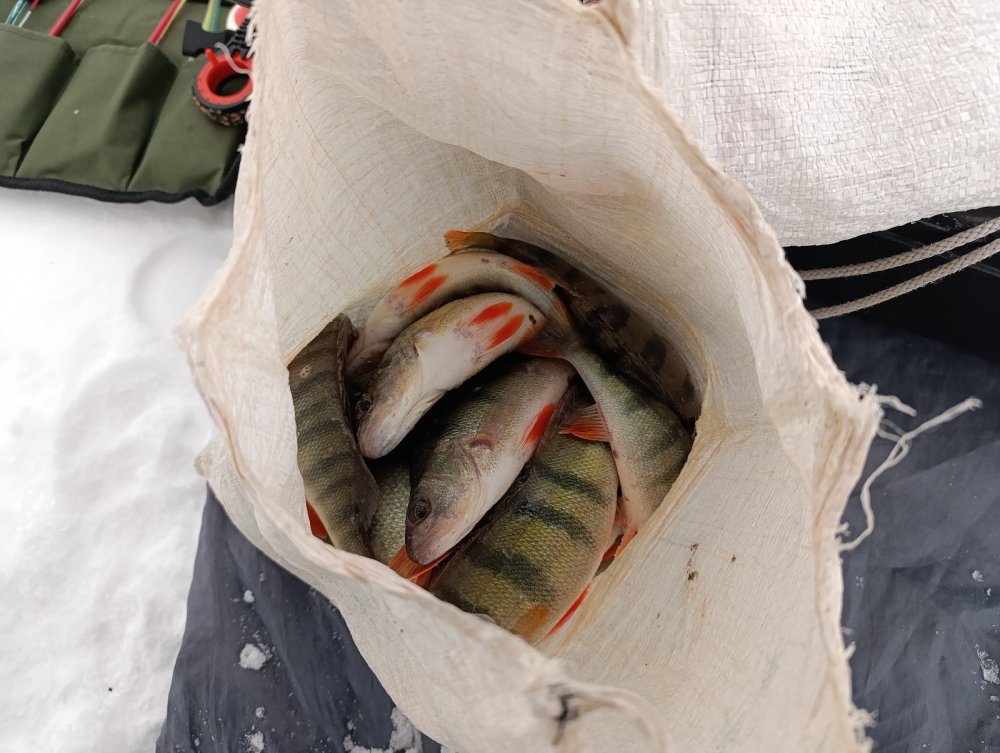 Съездили опять компанией на мелкоречку. Подо льдом, как водится, окушок. Лично я щучки не увидел. Хотя особо не искал и много не бурил. Сел на вчерашнюю лунку и потихоньку вытряхивал полосатика. Сегодня активность значительно ниже, чем вчера. В основном, с утра до 12 часов. Потом редко клевал. Хотя бродил окушок повсеместно почти. Сменил несколько мест под кустиками, что-то вытряхивалось. В целом, рыбалкой доволен, 3500 гр полосатого забрал, много отпустил.
