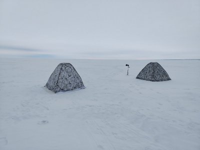 Первым делом зарядили три жерлицы, Саньку одел ратллин "Кондор", провёл краткий инструктаж (у него "Дебют на вибы 😃),а сам присел на лунку под кустом.