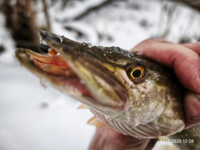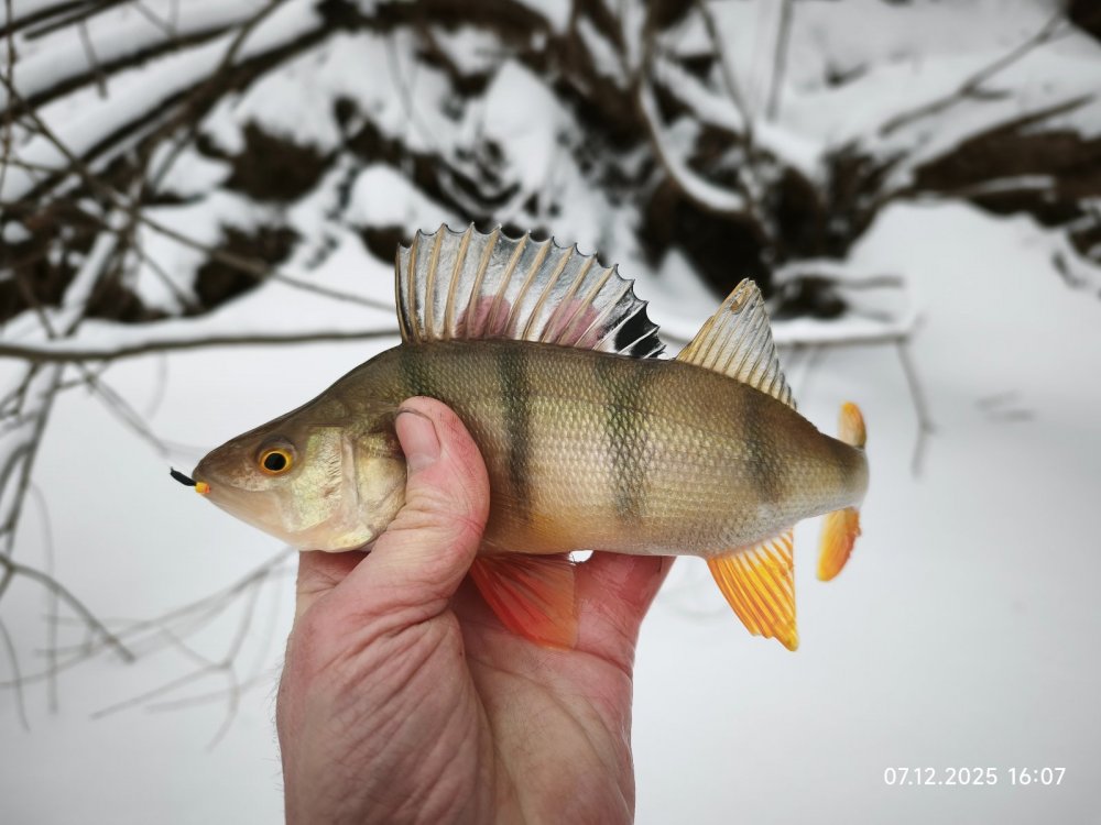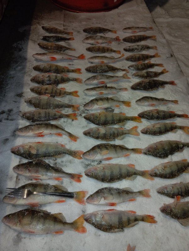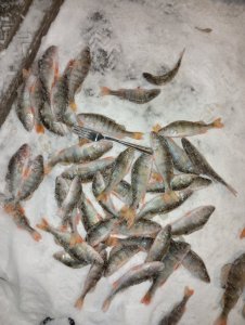 На лёд мы вышли в районе 16 час. Папа разбурил ямку и первая же лунка начала выдавать поклёвки.Такое большое количество судачих поклевок я давно не помню. На яме видно было неплохое количество судака. У папы был один обрыв - леска пойманую рыбу не выдержала, смог протащить ее только пару метров. У меня была похожая ситуация - клюнул судачек на грам 500, начала тащить, чувствую - удар, кто-то его тянет обратно и свою пойманую рыбу просто выдираю из чей-то пасти. Когда вытащила с лунки он был весь ободранный, кто-то проглотил его целиком.