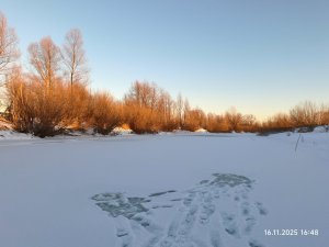 Ну, а так, обстановка такая: лёд до 10-12 см (там, где лёд), сухой, есть участки открытой воды и переходные зоны.