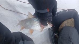 Пошли дальше блудить. Уже после обеда немного нащупали рыбку на глубине от 7 метров. Капризная и очень труднодоговорная, на контакт с рыбаком никак не хотела идти. Приходилось уговаривать. В улове в основном сорога, и небольшая часть окушка. Вся рыба на мормыша окромя трёх штук, из которых пара штук на "чёртика" и лишь одна сорожка покушала одним мотыльком. Поклёвки редкие и шли на "лютую" тряску в сантимах 50 от дна. На леске 0,1 работали в основном "уралочки".