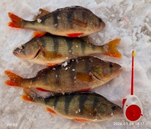 Сначала ходили искали рыбу в ямах, сорогу над лещом, окуня под лещом. Не увенчалось успехом, в ямах стоял один лещ. После ушли на течение, глубины 5,8-6,7. Нашли рыбу, которая постоянно бегала. Но рыба была наша, окунь и сорога. Поймаешь одного с лунки и дальше, а то и не успеешь опустить мормышку. Весело. Потом, товарищ уехал по делам, Я остался, бегал за рыбой. Рядышком сидела толпа, ловила леща. В толпу было совсем не охота, поэтому бегал за нужной рыбой. В какой то момент рыба встала на месте. И начал ловить. Была ошибка, что не поставил палатку. Попалили минут через 30-40. Успел поймать 17 штук. После рыба свалила и когда уже нашел, она заткнулась и не клевала.