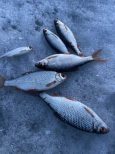 Рыбачил опять только на безмотылки. Из 12 удочек ловили только две. Чертик с розовой бусиной и латунный гвозде-шарик, обе мормышки по 0,5г, остальные все мимо, идет но не атакует.