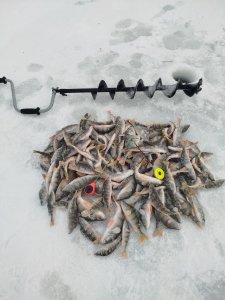 Прийдя на вчерашнюю лунку рыбы не обнаружил. Пришлось поискать немного. Оказалось окунь сместился метров на 50 в сторону и чуть глубже. Сразу пошли поклёвки и мешок стал стремительно наполнятся. Народ тоже стал подтягиваться, несмотря на шум окунь продолжал клевать. Правда клев был до 10, потом только редкие тычки и подъёмы за мормышкой. Еще и ветер подул не слабый. В общем принял решение не испытывать судьбу сегодня и идти домой. Рыбы и так неплохо поймал.