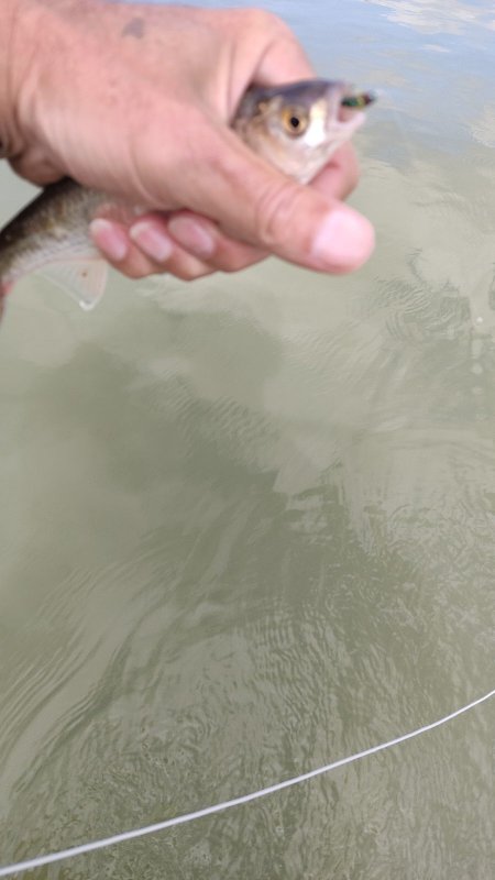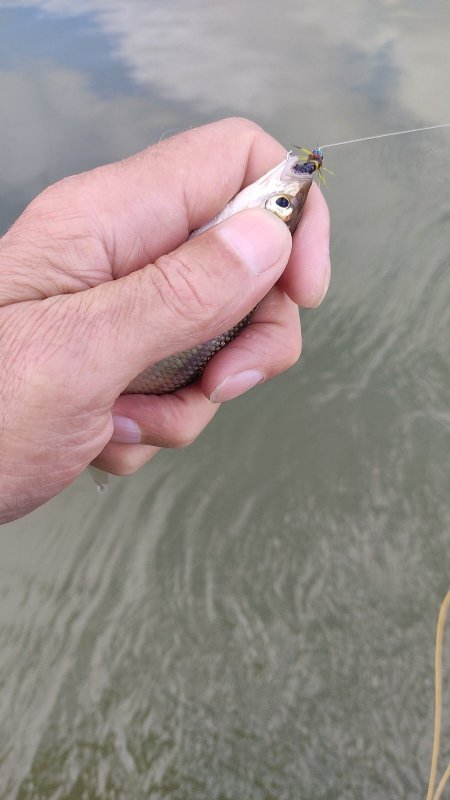 Вчера вечером решил в процессе проверить новые модели мух. Утром выехал на рыбалку. Приехал на место ( в ЮЛ. ) и только там вспомнил, что коробочка с мухами осталась дома. Летим домой за коробочкой. Забираем мухи и в обратный путь к месту рыбалки. По дороге вспоминаю - барсетку с документами,деньгами, таблетками и т.д. забыл дома. Разворот и опять домой 🤦. Дома понимаю, что добираться до места рыбалки буду долго и решаю поменять маршрут на более короткий. Приехал в Матвеевку почти в 12:00, быстро собрался и пошёл искать свою рыбу. Матвеевка оказалась не очень пригодным местом для ловли нахлыстом на муху. От берега сразу глубоко, очень много мест с обратным течением, а рыбе это почему-то не нравится. Нашёл небольшой и не глубокий перекат. На нём в основном и была поймана вся рыба сегодня. Много где ходил и пробовал, но либо 1-2 рыбки, либо вообще ничего. Вернулся к перекату, половил ещё минут 40 и всё, рыба на сегодня закончилась. В начале седьмого вернулся к машине.