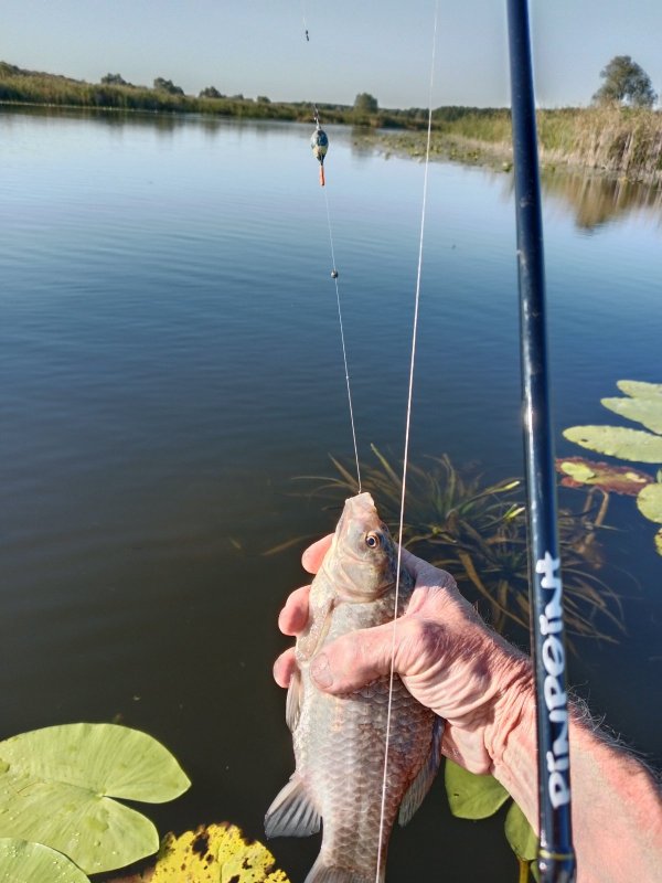 Карась явно не ждал меня, гуляя на мелях и делая винты у самой поверхности в широких окнах сплошного телорезника (водяная пальма), а в народе - мудорезника (18+)))