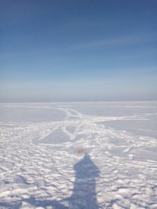 Докладываю по ледовой обстановки: тропы рыбацкие в пешем и моторизованном исполнении)есть, и в основном держат, но их немного. По нетронутой целине передвигаться сложно, снега полно, но наледь нам не попадалась. Лёд сухой сантимов так 70-80.