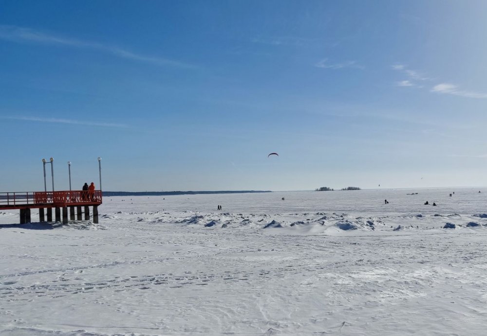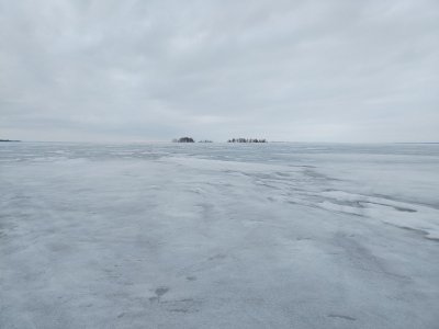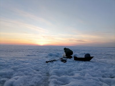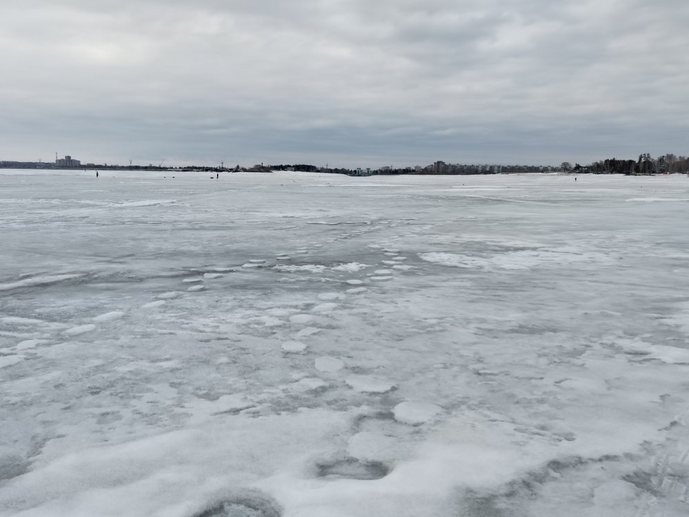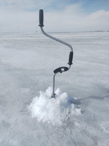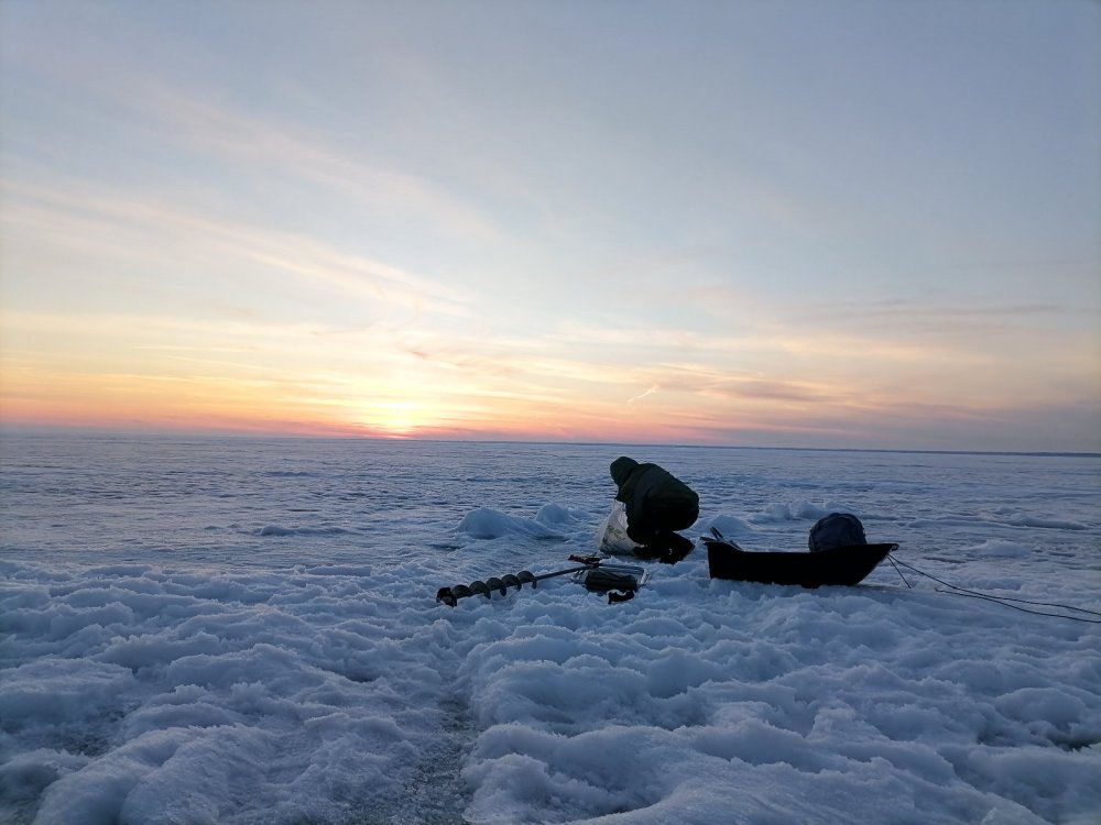 Ледовую обстановку оценю на 4 балла. Снег тает, воды не критично. Лёд сантимов 80, сырой. Водичка не мутная.