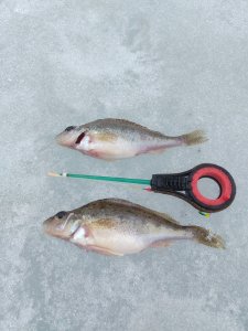 Рыбачили в основном на трёх - четырёх метрах, но были и на мели, от половины до метра. Леску ставил 0.1, 0.12 мм, наживка мормыш, пару поимок на бутерброд мотыля с опарышем. С медной тульской дробинки 0.4 грамма с мормышем на тонком острейшем крючке, почему то было много сходов, в том числе и зачётных окуней, пришлось заменить на уралку 0.5 грамм. На безмотылку - черный гвоздик со стальным шариком, клюнул самый крупный окунь, а так же подъязок, которого отпустил)